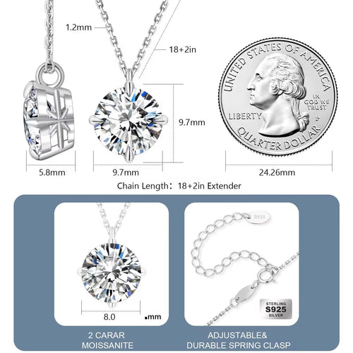 2 Carat Moissanite Pendant Necklace 925 Sterling Silver & 18K White Gold GRA Certified Round Brilliant Cut